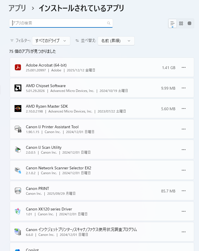 - インストールされているアプリの一覧を上からざっと眺める